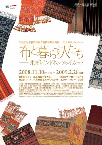 ●会期 2008/11/10〜12/19…第1部ティモール島西部のイカット 2009/1/13〜2/28…第2部フローレス島東部と島々のイカット ●開館時間 午前10時〜午後4時まで ●休館日 日曜・祝日・大学の定める休館日 2008/12/20〜2009/1/12までの展示替え期間
